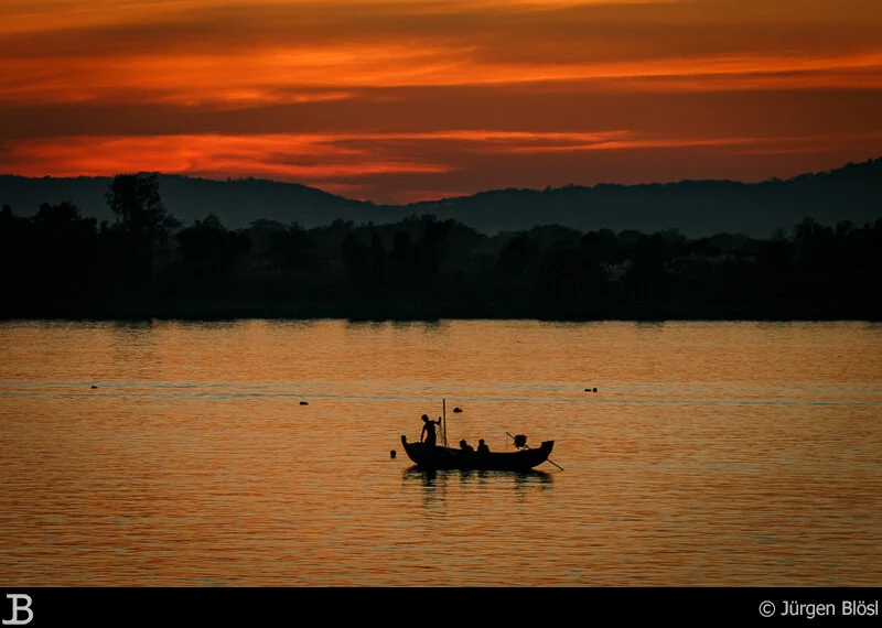 Ina, Heinfried und wir gehen am Ufer des Thanlwin entlang. Die Sonne geht schmalzig rot unter, ein Boot fährt auf den letzten Sonnenstrahlen entlang - romantisch. Wir laufen noch ein bisschen durch die dunklen Gassen und Ina und Freya bandeln mit kleinen Hunden an.