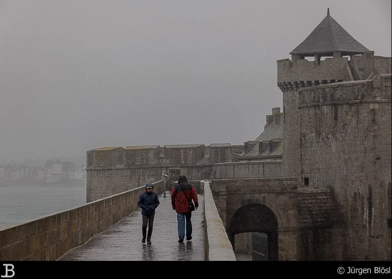Ein leckerer Start und bei dem heutigen Wetter ist jede Aufmunterung willkommen. Es regnet, dann schüttet es und zwischendurch nieselt es auch mal. Genau das Wetter, das zu einer dunklen, trotzigen Stadt wie Saint Malo [↗] passt. Wir parken am Hafen und gehen über die Brücke in die Stadt selbst. Wir schlendern durch die engen Gassen und schauen uns auch hier die Kirche an. Wir erklimmen die Stadtmauer und spazieren auf ihr um die Stadt. Die Stadt ist nicht so groß, warum sperrt man die Autos nicht aus?
