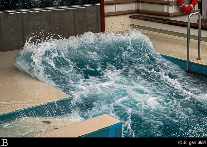 The distribution of parkas and shoes needs only a few minutes and takes place on the pool deck. Although “pool” is an exaggeration; “splash pool” is probably better fitting. But it was filled and everyone had fun watching the water spill over. The captain just made an announcement: The wave height is just 1.5 meters and the wind force is 3. So there's still plenty of room for more. By now, I only notice the movement of the ship when I pay attention.